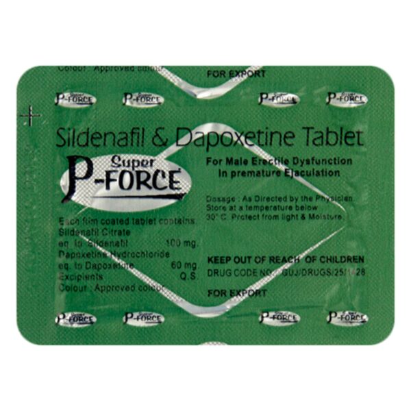 スーパーPフォースは、PDE5阻害剤と呼ばれる薬剤のグループに分類されています。シルデナフィル(100mg)とダポキセチン(60mg)を組み合わせた薬です。
